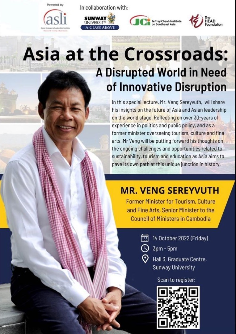 In this special event, Mr. Veng Sereyvuth, will share his insights on the future of Asia and Asian leadership on the world stage. Reflecting on over 30-years of experience in politics and public policy, and as a former minister overseeing tourism, culture and fine arts, Mr Veng will be putting forward his thoughts on the ongoing challenges and opportunities related to sustainability, tourism and education as Asia aims to pave its own path at this unique junction in history.