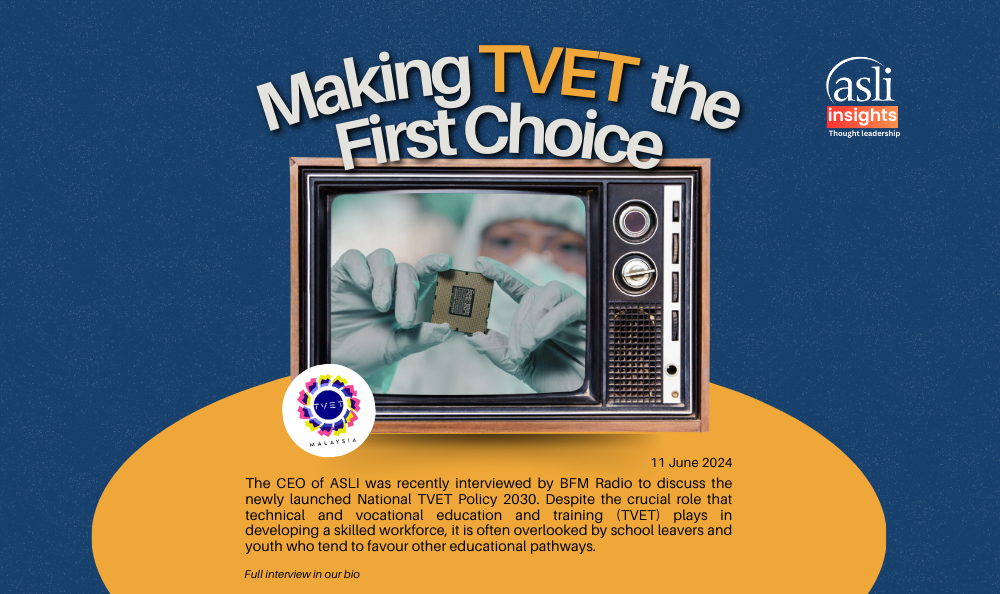 The CEO of ASLI recently discussed the potential of the National TVET Policy 2030 on BFM Radio. ASLI highlighted three key metrics to assess TVET programmes in Malaysia: Employability, Industry Satisfaction, and Industry Demand. Recent investments from companies like Infineon, NVIDIA, and Tesla signify an increasing demand for skilled talent from our vocational schools.